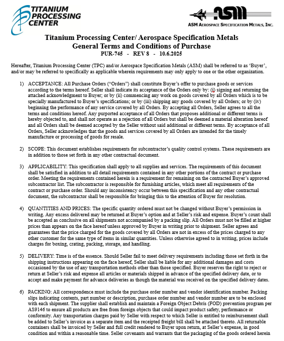 AEROSPACE SPECIFICATION METALS TERMS AND CONDITIONS OF SALES & PURCHASE TERMS AND CONDITIONS OF SALES & PURCHASE Search Search Terms & Conditions of Sales and Terms & Conditions of Purchase are available for download in the PDF format. Click Here to Download the Terms & Conditions Of Purchase Click Here to Download the Terms and Conditions of Sales HEADQUARTERS LARGEST TITANIUM INVENTORY IN NORTH AMERIACAPRODUCT INFORMATION PAGEHIGH TEMP METALS PRODUCT INFORMATIONALUMINUM PRODUCT INFORMATIONSTAINLESS STEEL PRODUCT INFORMATIONALLOY STEELPRODUCT INFORMATION PAGE FORGINGSPRODUCT INFORMATION PAGE Previous slide Next slide 1-800-398-4345 1-954-977-0666 Sales@aerospacemetals.com 2501 N.W. 34th Place #B29 Pompano Beach, FL 33069 BUY ONLINE INSTAQUOTE CONTACT US WE ARE HERE TO SOLVE YOUR ISSUES YOUR RELIABLE DISTRIBUTOR LARGEST TITANIUM INVENTORY IN NORTH AMERICA COMPETITIVE PRICES THE SHORTEST LEAD TIME IN THE INDUSTRY Previous slide Next slide